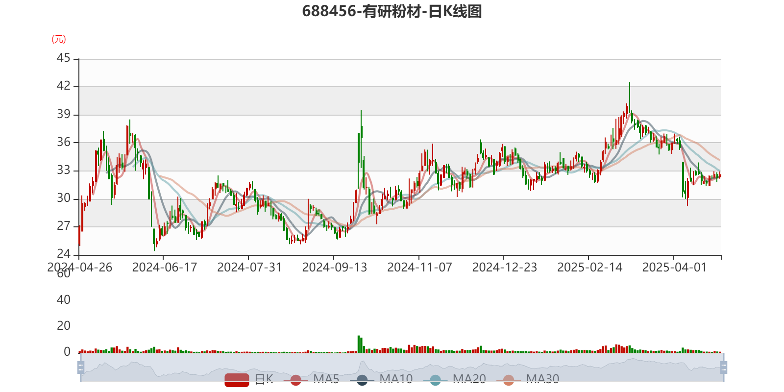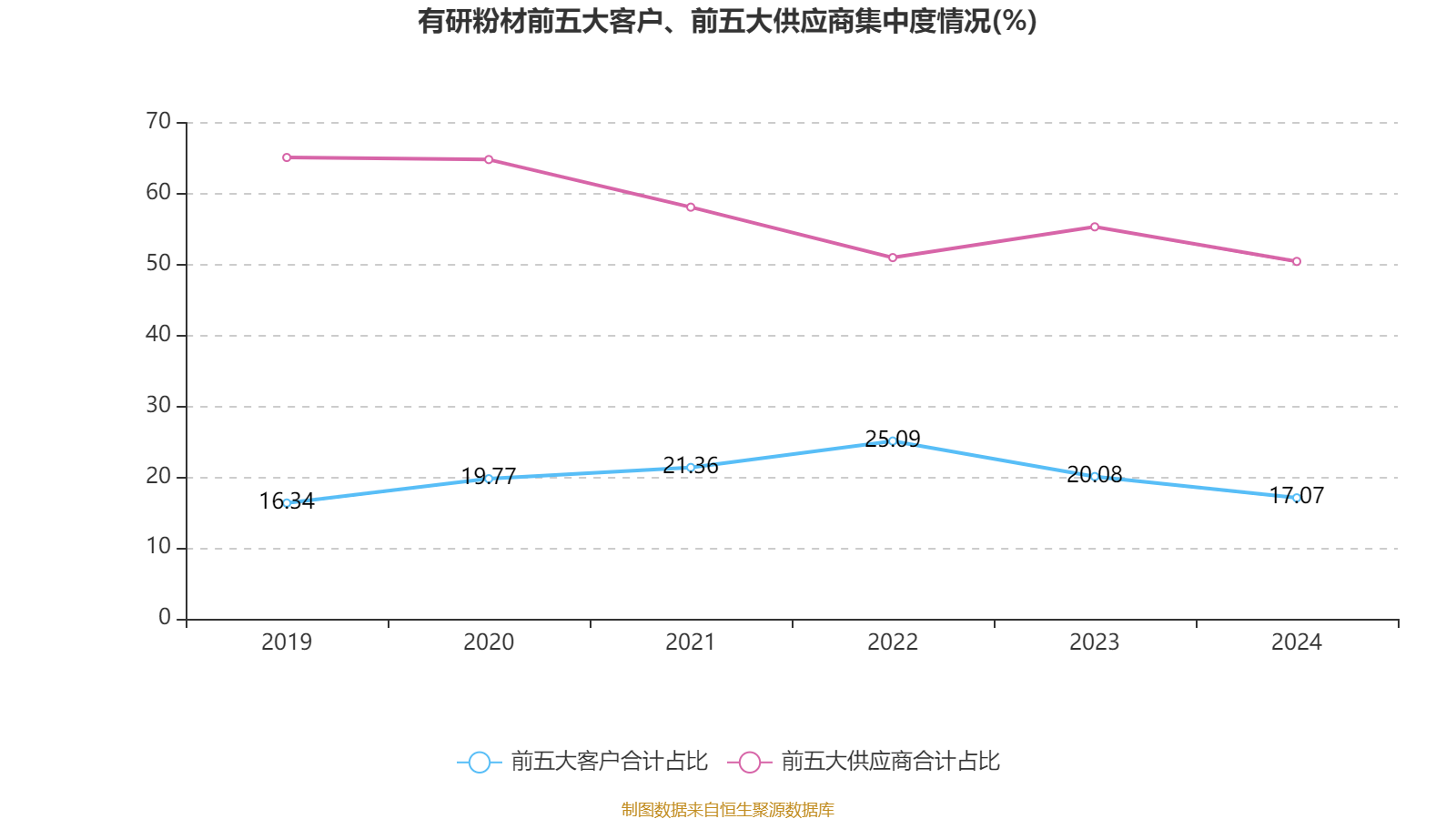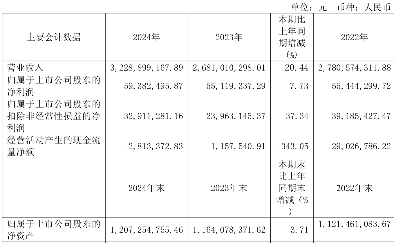 中证智能财讯有研粉材(688456)4月26日披露2024年年度报告。2024年,公司实现营业总收入32.29亿元,同比增长20.44%;归母净利润5938.25万元,同比增长7.73%;扣非净利润3291.13万元,同比增长37.34%;经营活动产生的现金流量净额为-281.34万元,上年同期为115.75万元;报告期内,有研粉材基本每股收益为0.57元,加权平均净资产收益率为5.06%。公司2024年度分配预案为:拟向全体股东每10股派现2元(含税)。