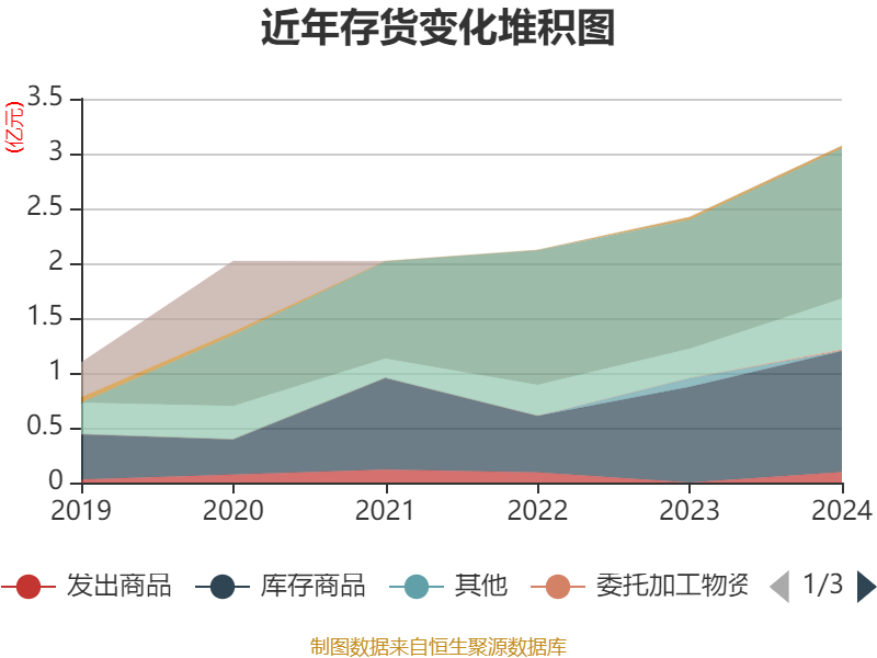 从存货变动来看,截至2024年末,公司存货账面价值为3.07亿元,占净资产的25.43%,较上年末增加6486.4万元。其中,存货跌价准备为158.08万元,计提比例为0.51%。