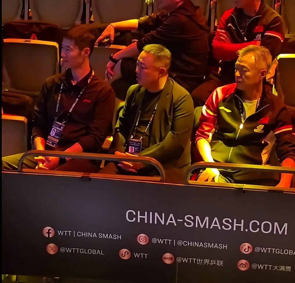 刘国梁戴着工作胸牌(他可是WTT高层),笑盈盈的,气色很好。刘国梁和前排国乒教练团队工作人员握手。王励勤和先一步坐下,秦志戬也是乐呵呵地看着刘国梁和曾经的同事亲切握手。坐定以后,刘国梁不时把手搭在王励勤的后背上说着什么,看得出,两人的关系依然很好,随意、亲和——可是呢,过去的二十多年里,他们在一起并肩战斗的时间太长了。